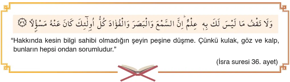 İnsanın sahip olduğu bilgiler; genellikle habere, gözleme ve akla dayanır. İsra suresinin 36. ayetinde göz, kulak, kalp gibi bilgi kaynaklarının doğru kullanılması gerektiği, elde edilen bilgilerin kullanımından sorumlu olunduğu ifade edilmektedir. Bununla birlikte kişinin doğruluğu ya da yanlışlığı kesin olarak kanıtlanamayan bilgiye göre hareket etmemesi istenmektedir. İnsan, davranışlarını ayette verilen mesajlara göre şekillendirdiğinde ortaya çıkabilecek pek çok sorunu engellemiş olur.