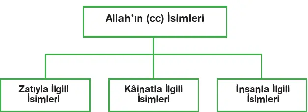 Allah’ın (cc) isimleri üç başlık altında incelenir. Bunlar; Allah’ın (cc) zatıyla, kâinatla ve insanla ilgili isimleri şeklinde ifade edilmektedir.
