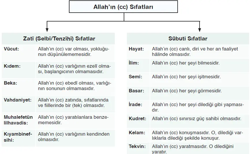Allah’ı (cc) daha iyi tanımak için O’nun isimlerini bilmenin yanında sıfatlarını da bilmek gerekir. Bu sıfatlar çeşitli şekillerde ifade edilmiş olsa da genel olarak zatî ve sübuti sıfatlar olarak ikiye ayrılır. Allah’ın (cc) zatî sıfatları kendine has sıfatlardır. Bu sıfatların Allah’tan (cc) başka bir varlık için düşünülmesi mümkün değildir. Örneğin Allah’ın (cc) ezelî olduğunu ifade eden kıdem sıfatı O’na özgü olup başka bir varlık için düşünülemez. Sübuti sıfatlar ise Allah’ın (cc) niteliklerini ve kusursuz oluşunu ifade eder. Bu sıfatlar ezelî ve ebedî olup yaratılmışların sıfatları gibi sonradan meydana gelmiş değildir. İsimlendirmede benzerlik olsa da sübuti sıfatlar yaratılanların sıfatına benzememektedir. Örneğin Allah’ın (cc) görmesini ifade eden basar sıfatıyla, insanın görme yetisi arasında sadece isim olarak benzerlik vardır. Dolayısıyla Allah’ın (cc) görmesinin canlıların görmesiyle aynı olduğunu düşünmek doğru değildir.