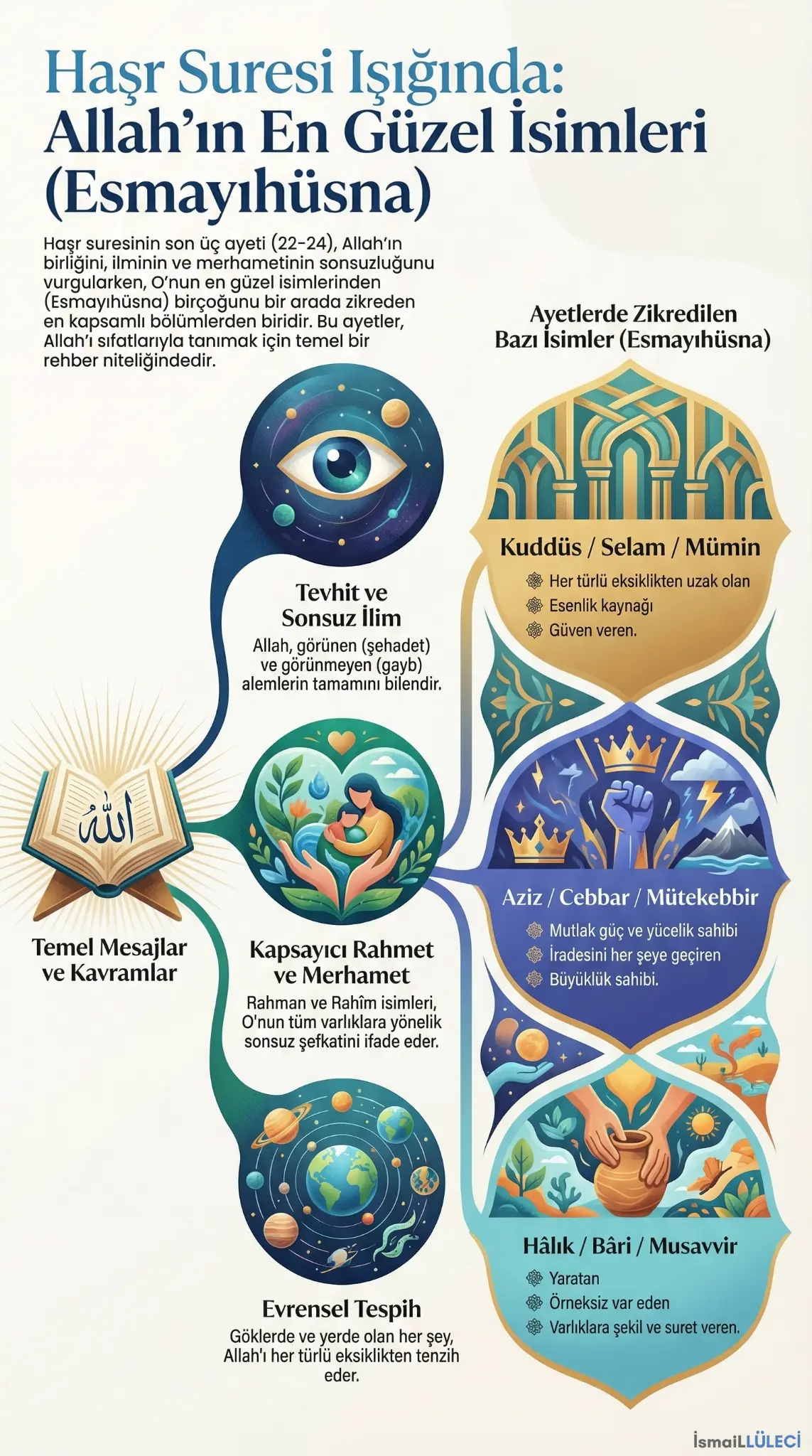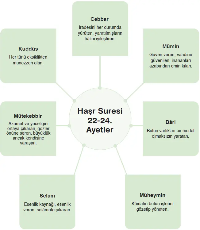 Allah (cc) Kur’an’da kendisini insanlara isim ve sıfatlarıyla tanıtır. Allah’ın (cc) isim ve sıfatlarından bazılarının zikredildiği Haşr suresinin 22-24. ayetleri bunun örneklerinden biridir. Bu ayetlerde Allah’ın (cc) bazı isimleri üzerinden O’nun birliğine ve ilminin sonsuzluğuna dikkat çekilir. Ayetlerde öne çıkan bir başka konu da Allah’ın (cc) rahmetinin genişliğidir. Ayrıca en güzel isimlerin Allah’a (cc) özgü olduğu vurgulanarak O’nun kusursuz oluşuna işaret edilir. İlgili ayetlerde Allah’ı (cc) anlatan ifadelerin tamamı insanın Rabbini daha iyi bilmesine yöneliktir. Dolayısıyla bu ayetlerde söz konusu isim ve sıfatların zikredilmesinden maksat Allah’ı (cc) doğru tanıtmaktır.