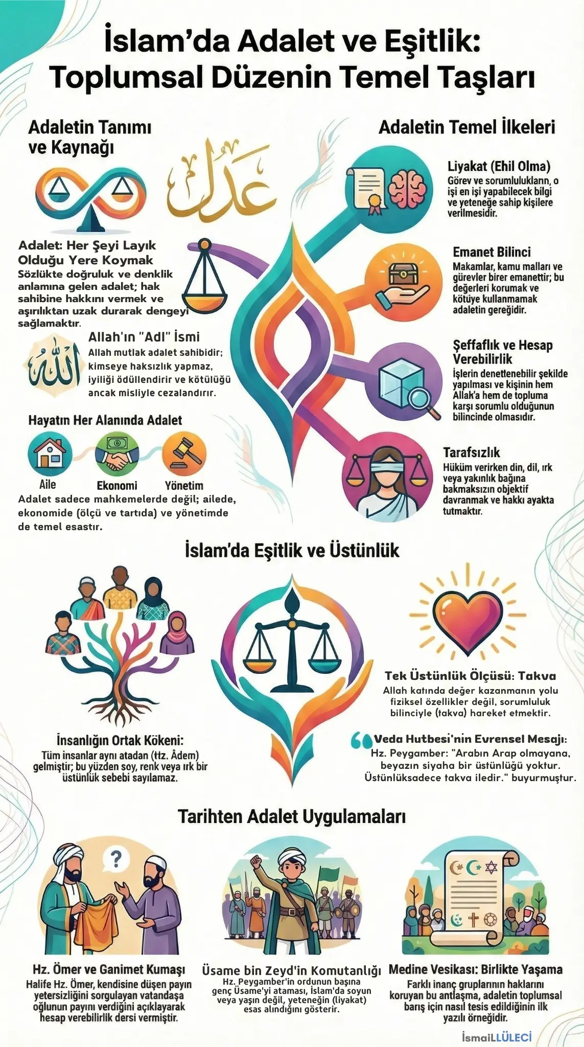 Bireysel ve sosyal hayatın vazgeçilmez bir unsuru olan adalet, İslam’ın gözettiği temel insani değerlerin başında gelir. İslam’da adalet, haklı olanın hakkını koruma anlayışı üzerine inşa edilmiştir. Böylece din, dil, ırk ve sosyal statü farkından dolayı insanlara ayrıcalıklı muamelede bulunmanın önüne geçilmek istenmiştir. Bunun için İslam; eşitlik, hakkaniyet, dürüstlük, şeffaflık, tarafsızlık, emanet, liyakat, ahde vefa, insanın saygınlığı ve hesap verebilirlik gibi evrensel adalet ilkelerini ortaya koymuş ve adaletin sağlanması için de bu ilkelere uymak gerektiğini bildirmiştir. İslam, adaletin uygulanmasında aksaklığa yol açabilecek sevgi, nefret gibi duygulara yer verilmesini engellemiştir. Adaletin gerçekleştirilmesinde hak ve haklı olma hâlini merkeze alan bir anlayış tesis edilmiştir. Görev ve sorumlulukların ehil kişilere verilmesi, adaletin sağlanmasında liyakat ilkesinin önemsenmesi Kur’an-ı Kerim’de şöyle ifade edilmiştir: “Şüphesiz Allah size emanetleri ehline vermenizi ve insanlar arasında hüküm verdiğinizde de adaletle hükmetmenizi emreder…”