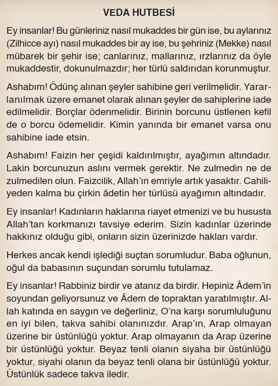 Veda Hutbesi’nde insanlara yönelik önemli mesajlar verilmiş ve kul haklarıyla ilgili konular ele alınmıştır. Veda Hutbesi’nde Allah’ın (cc) affetmeyeceği kul hakkına büyük önem verilmesi dikkat çekicidir. Hz. Muhammed (sav) Veda Hutbesi’nde; can ve mal dokunulmazlığı, faiz ve kan davalarının kaldırılması, suçun kişisel olduğu, eşlerin hakları ve sorumlulukları, Müslüman kardeşliği, Müslümanların birbirleriyle savaşmaması ve emanetlerin sahiplerine geri verilmesi gibi kul haklarını ilgilendiren konulara değinmiştir.Veda hutbesinin bir bölümün de Hz. Peygamber Müslümanlara şöyle seslenmiştir: