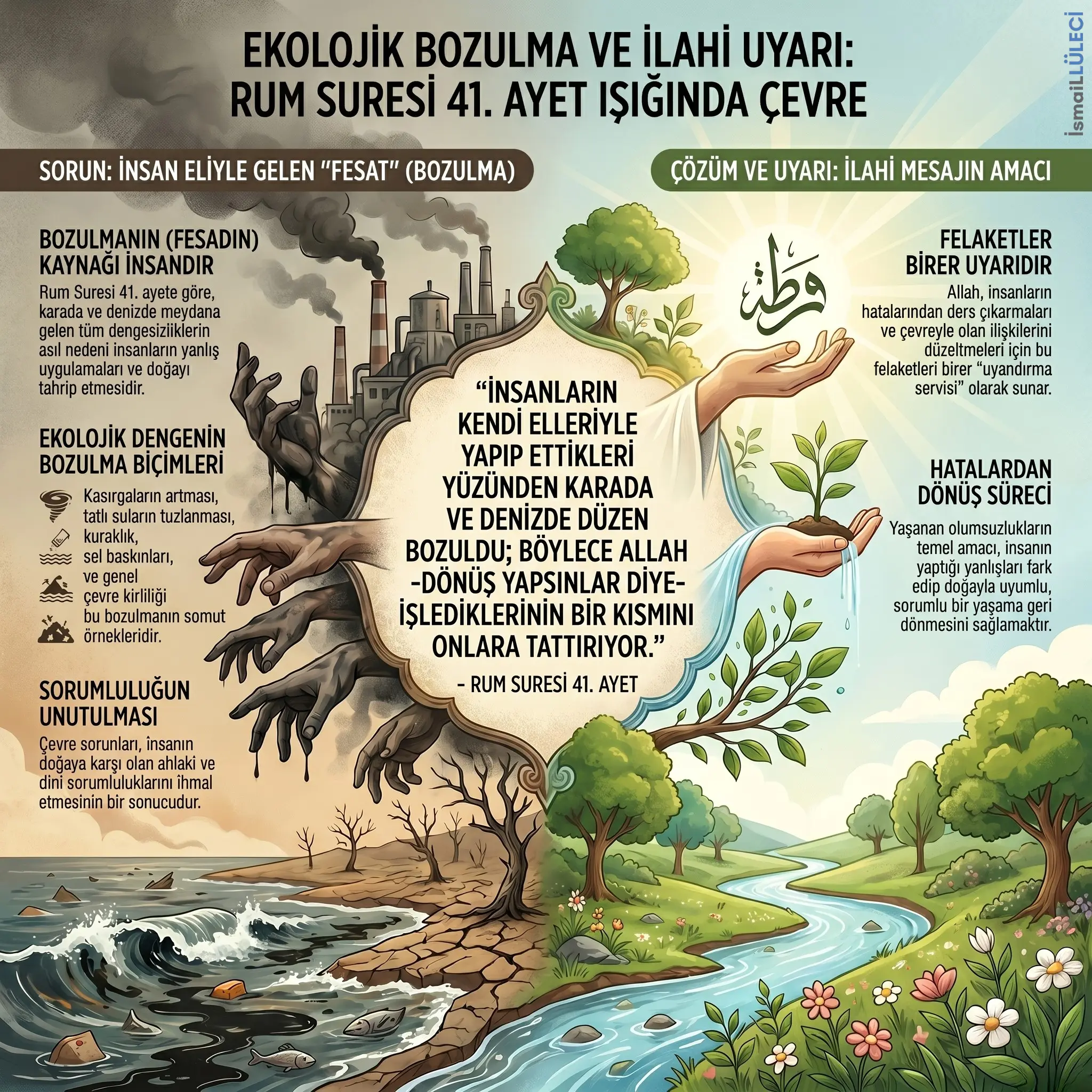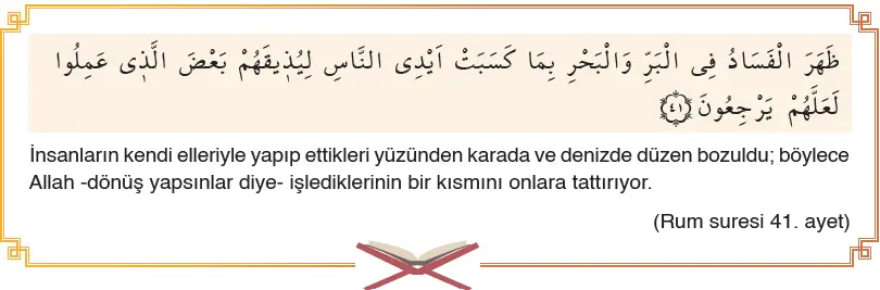 İnsan, akıl ve irade sahibi olarak yaratılmış ve tercihlerinde özgür bırakılmıştır. Yaptığı tercihler bazen olumlu bazen de olumsuz sonuçlar doğurmaktadır. Bu sonuçlardan sadece kendisi değil tüm varlıklar etkilenebilmektedir. Rum suresinin 41. ayetinde de bu hususa dikkat çekilmektedir.