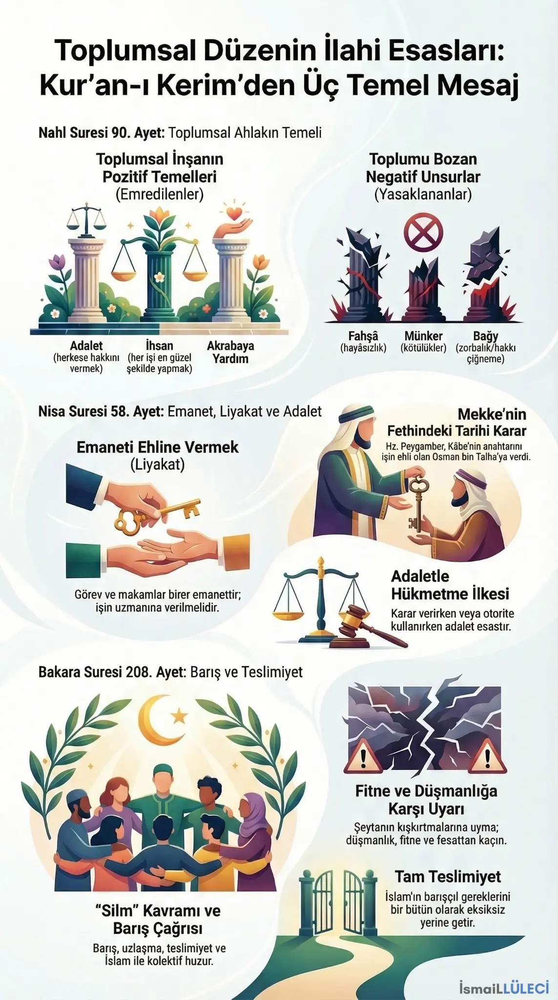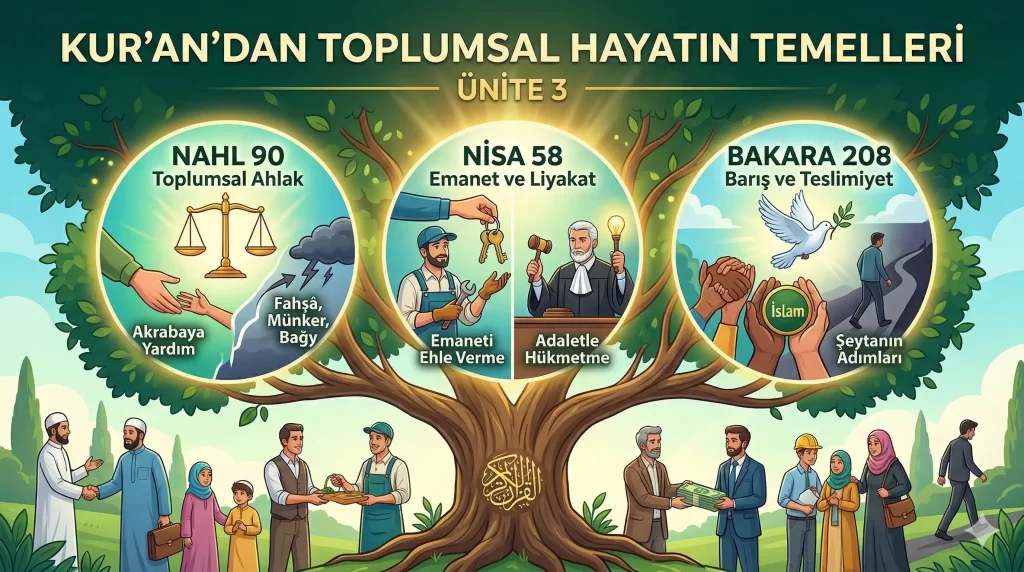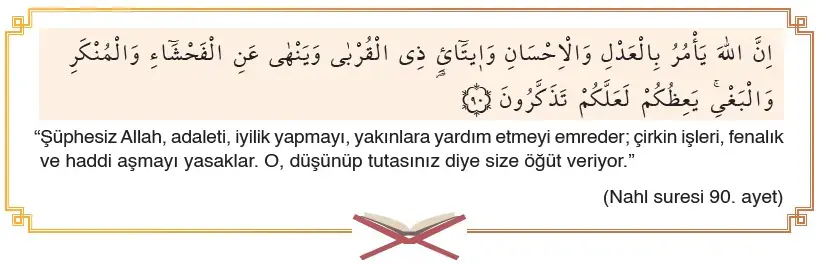 Varlıkların yaratıcısı olan Allah (cc) insana akıl ve irade vermiş, onu davranışlarından sorumlu tutmuştur. Peygamberler aracılığı ile insana bu sorumluluklarını bildirmiş, ondan bu çerçevede hareket etmesini istemiştir. Nahl suresi 90. ayette Allah (cc), sağlam temellere dayanan bir toplumun oluşması için bazı ahlaki ilkeleri emretmiştir. Bununla birlikte hem bireye hem de topluma zarar veren tutum ve davranışları yasaklamıştır.