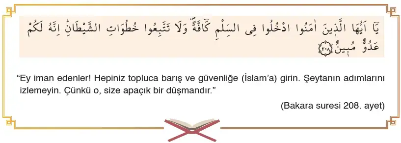 İslam, Müslümanların hem bu dünyada hem de ahirette mutlu olmalarını ister. Bu sebeple insanların dinin emir ve yasaklarına hakkıyla uymalarını, şeytanın vesveselerinden kaçınmalarını emreder. Yüce Allah Bakara suresinin 208. ayetiyle inananları bu konuda uyarmaktadır.